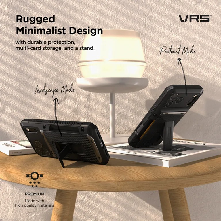 VRS Design Damda Glide Hybrid เคส Wallet ของ iPhone ที่รวมทุกฟังก์ชันไว้ในชิ้นเดียว สามารถเก็บบัตรได้สูงสุดที่ 4 ใบแบบเลื่อนเรียบ ปกป้องแรงกระแทกด้วยโครงสร้างแข็งแรงสามชั้น (TPU + PC + โลหะ) มาพร้อมขาตั้ง Kickstand ในตัว ใช้ดูวิดีโอได้แบบ hands-free หน้าจอตั้งเฉย ๆ ได้เลย เป็นเคสอีกตัวที่ฟังก์ชันครบในหนึ่งเดียว