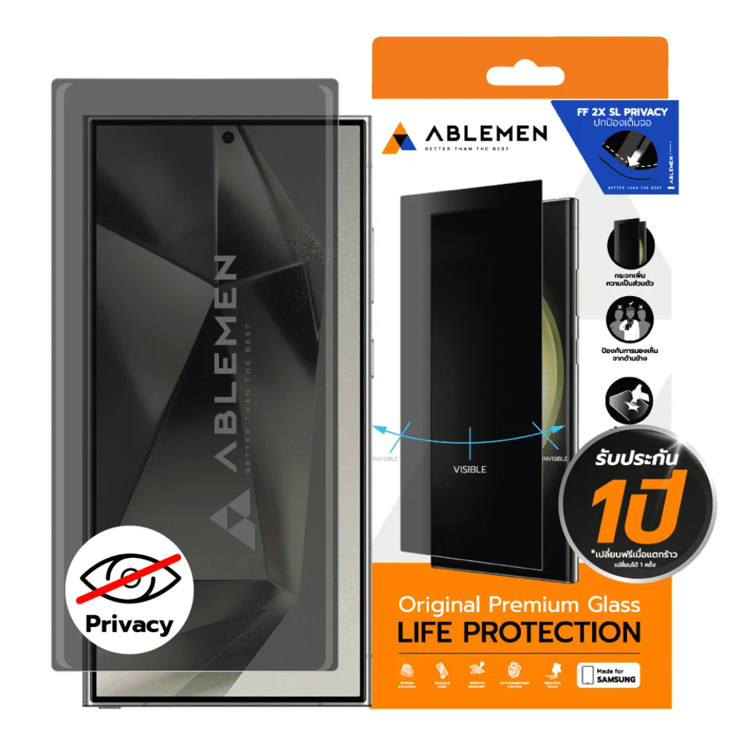 กระจกปกป้องจอชนิดเต็มจอเพิ่มความเป็นส่วนตัว (Ablemen Full Frame Privacy) ถูกพัฒนาเพื่อตอบโจทย์เรื่องความเป็นส่วนตัว ผสานกับ Heavy Impact Technology ทำให้พื้นผิวกระจกเรียบเนียน ขอบแข็งแรงและยืดหยุ่นเป็นพิเศษ สามารถรองรับแรงกระแทกจากความสูงกว่า 2 เมตร ลดโอกาสในการแตกของกระจก กันรอยขีดข่วนได้ดีระดับ 9H ผิวกระจกเคลือบสารพิเศษจากประเทศญี่ปุ่น ที่ผ่านกระบวนการ Plasma Coating ทำให้สัมผัสนุ่ม ทัชลื่น ทนทานใช้งานได้นานไม่ฝืด และเคลือบทับด้วยสารที่มีคุณสมบัติกันน้ำและไขมัน (Hydrophobic & Oleophobic) ทำให้สามารถลดรอยคราบมันและคราบสิ่งสกปรกได้ดียิ่งขึ้น