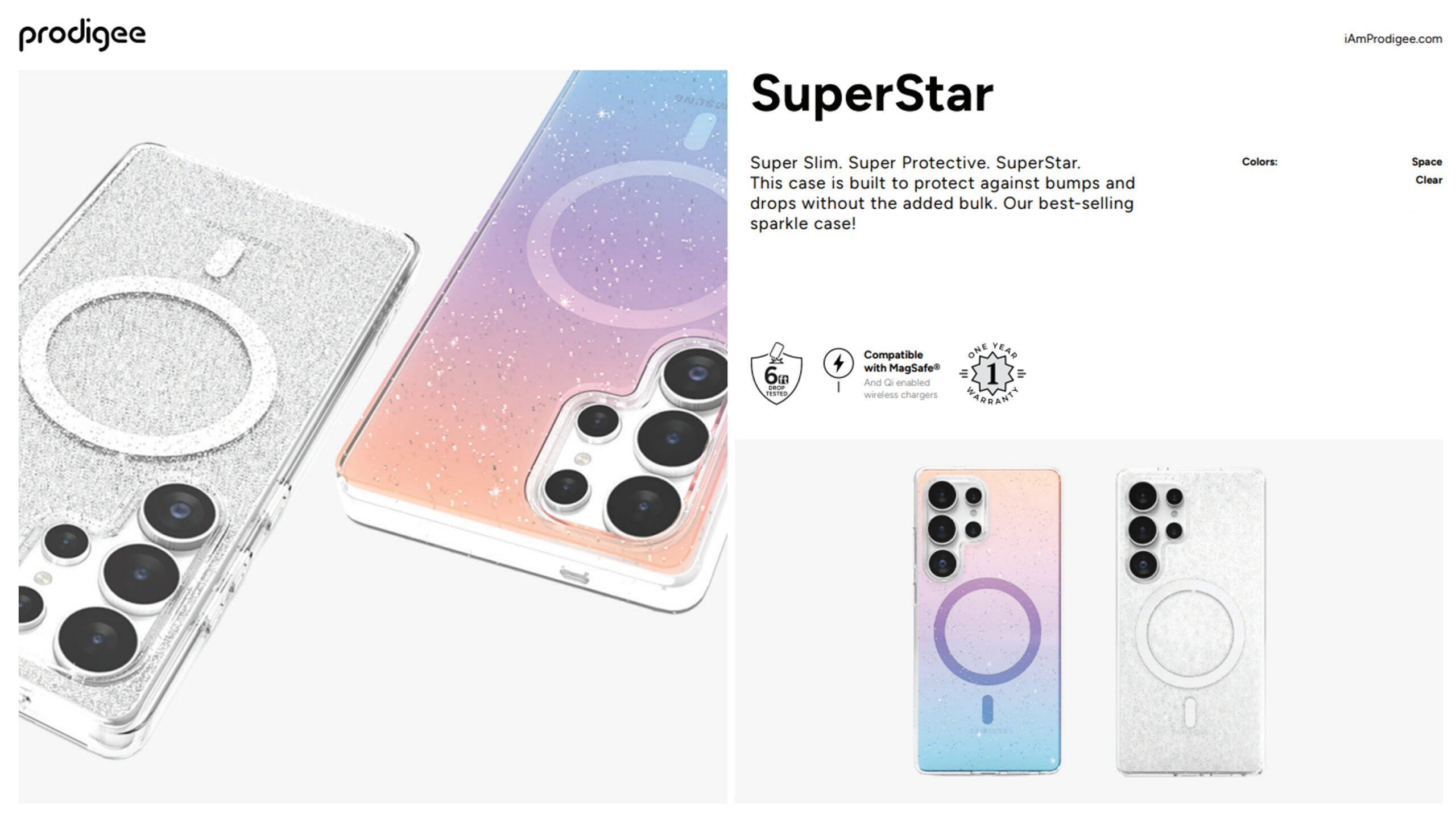 SUPERSTAR (ซุปเปอร์-สตาร์) เคสที่เปล่งประกายระยิบระยับ ด้วยกากเพชรที่อยู่ในเนื้อเคส ยิ่งโดนแสงยิ่งสวย ให้ลุคหรูหรา เหมาะกับสาว ๆ สายแกลม สายแฟชั่นสุด ๆ นอกจากนี้ยังผ่านการ drop-tested ที่ความสูงถึง 2 เมตร ปกป้อง Galaxy S26 Ultra ของคุณได้อย่างมั่นใจ และมีวงแม่เหล็ก รองรับการใช้งานร่วมกับอุปกรณ์ MagSafe อีกด้วย