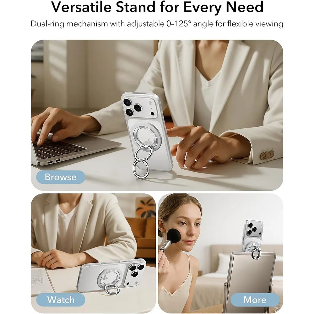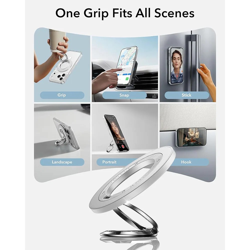 - Grip & stand ใช้งานได้หลายแบบ ใช้เป็นแหวนสำหรับถือมือเดียว ตั้งมือถือแนวตั้ง/แนวนอน ใช้เป็น stand ตอนดูคลิป, หรือคล้องกับที่วาง Car-mount หรืออุปกรณ์ Magnetic ได้โดยตรง