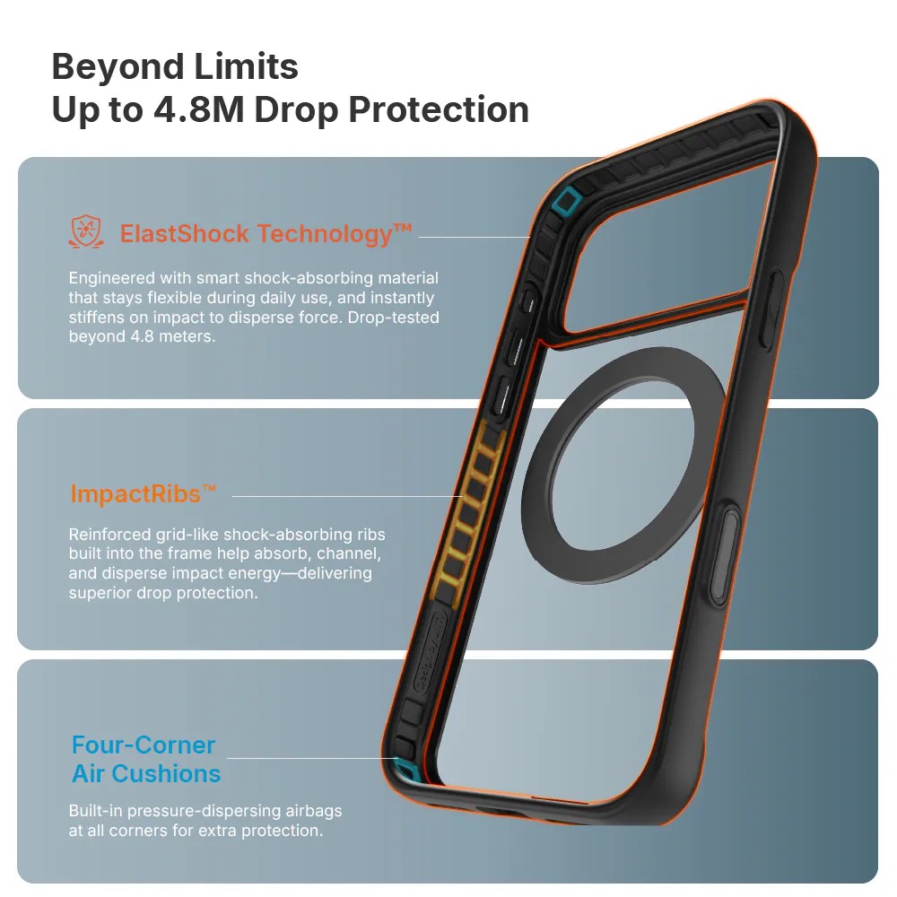 - มุมทั้ง 4 มีเทคโนโลยีดูดซับแรงกระแทก เพิ่มความทนทานเมื่อเครื่องตกหล่น
