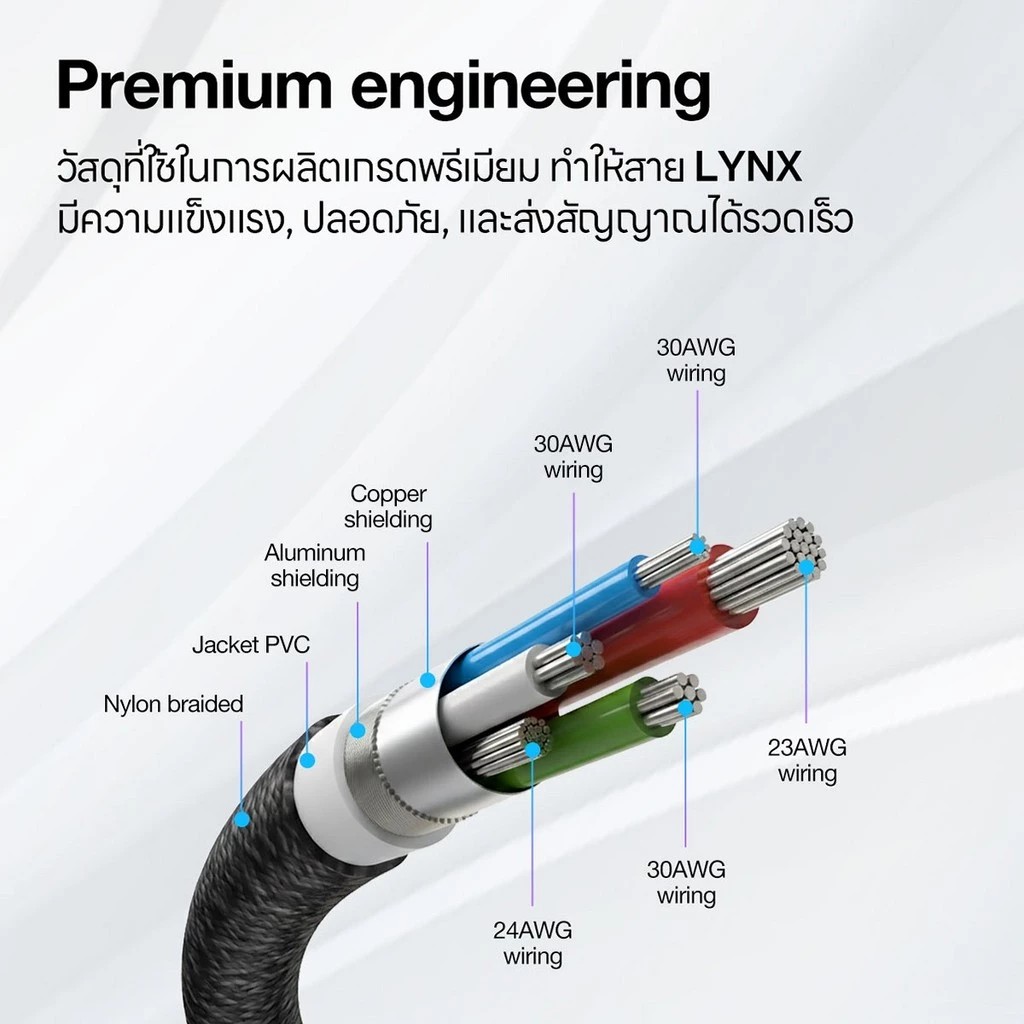 • สายชั้นนอกผลิตจากผ้าไนล่อนแบบถัก (Nylon Braided) ที่แข็งแรงทนทานในการใช้งาน ให้สัมผัสพรีเมียม