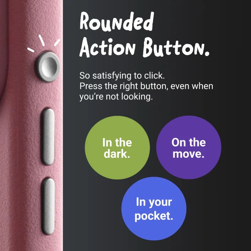 • ปุ่ม Action Button วัสดุ Aluminum ทรงกลมที่ทำมาแยกกกับรูปทรงของปุ่ม เพิ่ม-ลด เสียงได้ชัดเจน ทำให้ไม่ต้องมองก็กดโดน