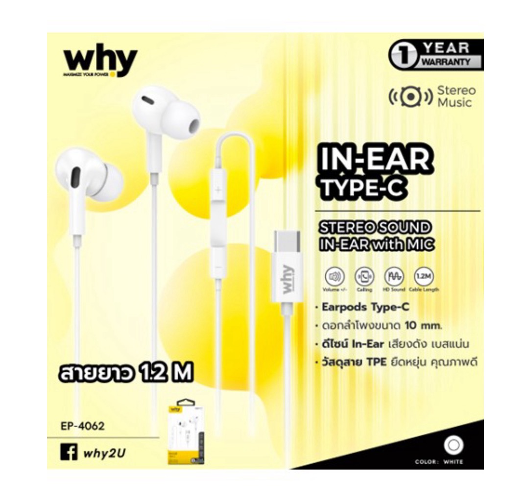 หูฟัง Type-C รุ่น Why Tone EP-4062 มาพ้อมกาะกัน 1 ใช้ะบบ In-Ear (อินเอียร์) ยาว 1.2 ออกแบบำหรับกช้านเป็นทั้งหูฟังและไมรโฟน เหมาะสำหรับการเล่นเกม รุ่น Limited Edition สินค้าใหม่ คุณภาพเยี่ยม
