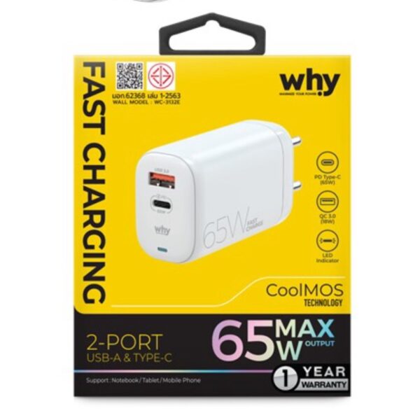Starlight Wall Charger 65W (WC-3132E) จาก Why เสนอประสิทธิภาพการชาร์จรวดเร็วด้วย GaN Technology ในขนาดพกพา รองรับ Fast Charge Port Type-C PD และ USB-A มีระบบตัดไฟเมื่อชาร์จเต็ม พร้อมรับประกันสินค้า 1 ปี ผลิตจาก ABS ทนความร้อนและแข็งแรง เหมาะสำหรับสมาร์ทโฟน แท็บเล็ต และโน้ตบุ๊ค พกพาสะดวกและปลอดภัยในการใช้งาน.